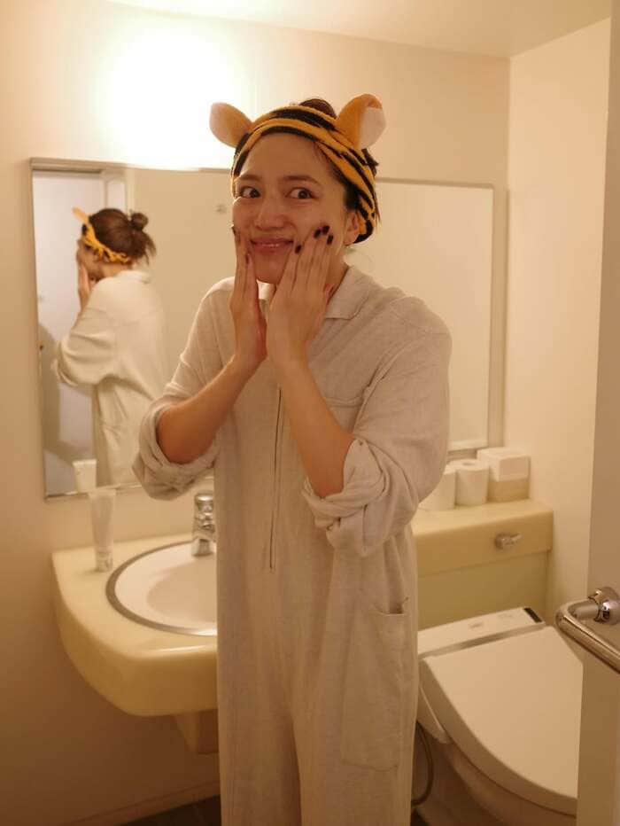 髪の毛をくくり、ディズニーキャラクターのティガーのヘアバンドでおでこも全開な川口さんが、メイクを落としているのか、お肌がつやつやのすっぴん姿で両手で口を覆ってカメラを見つめています!