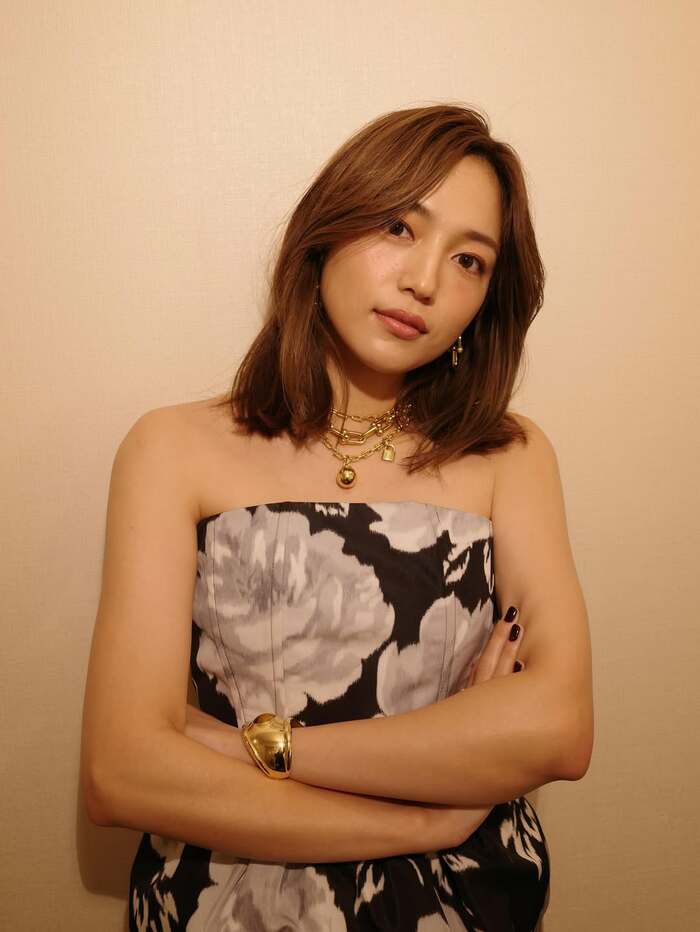 その写真には、年末に出演した番組で着用していた衣装で、デコルテを大胆に見せたベアトップのドレスに身を包み、腕を組んでいる川口さんの姿が写し出されています。