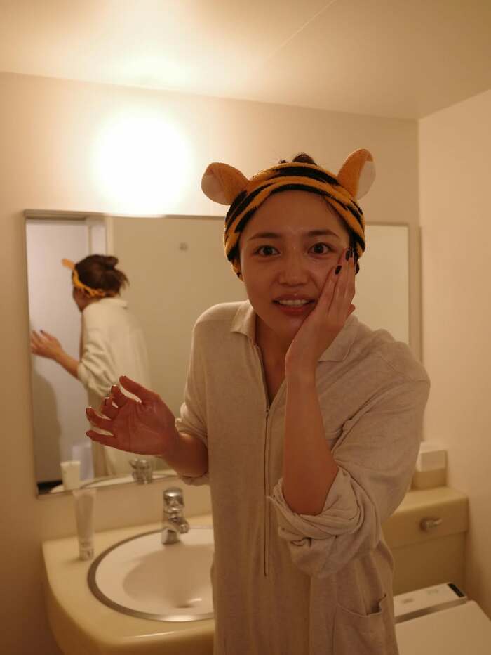 さらに、上下がつながったロンパースのような部屋着姿で、お肌のケアをしている川口さんは、目を開いて、口をにんまりとさせた表情を浮かべたり…