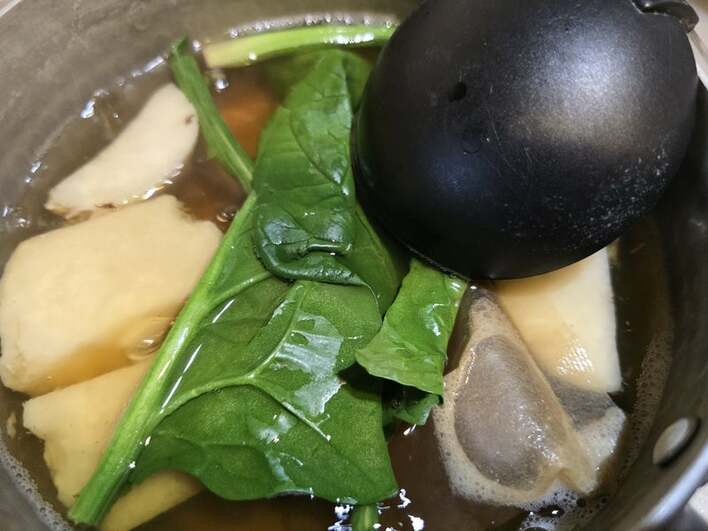 すまし汁仕立てにしたつゆに、ほうれんそうと里芋を鍋に入れて一煮立ちさせ…