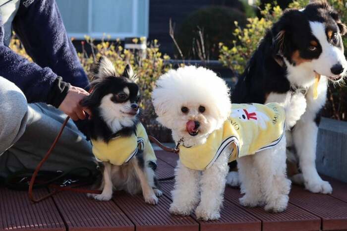 高橋さんが「部屋のなかで箱根駅伝を応援しています(笑)」という中、愛犬たちは3匹そろってお出かけした様子。カメラ目線でぺろっとする姿が愛くるしくてたまりませんね。