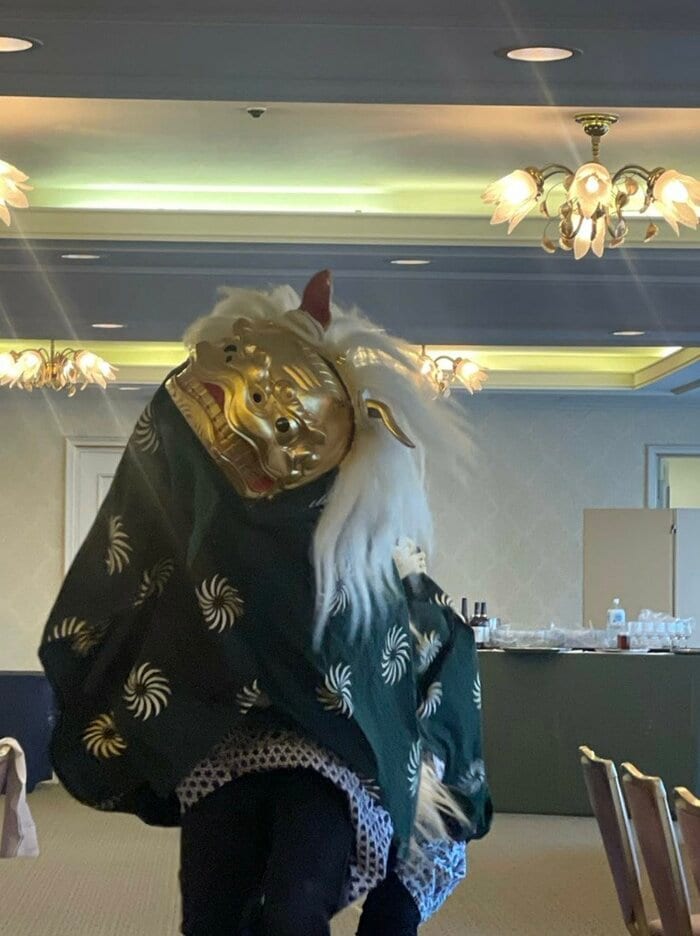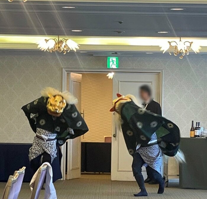 市川さんは「正月らしい、正月です。」とつづり、獅子舞の写真も投稿。ホテルの宴会場のような室内で、二人の演者が力強く舞っています。