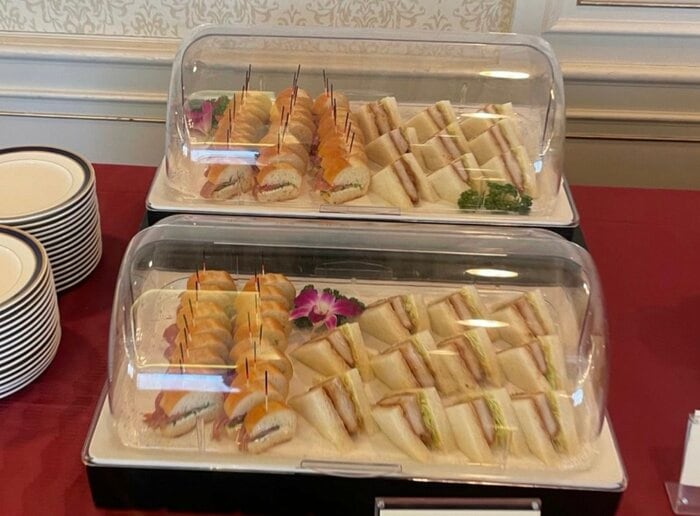おせちだけでなく、イベント用のサンドイッチ盛り合わせも用意されていました。赤いテーブルクロスの上に置かれた二段のトレイには、2種類のサンドイッチが整然と並んでいます。