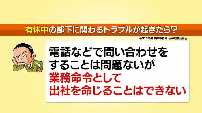 弁護士の先生によると、有給休暇中でもトラブルについて電話を入れるのはOKですが、業務命令として出社を命じるのはNGで、もし電話が通じなくても部下を責めることはできないといいます。