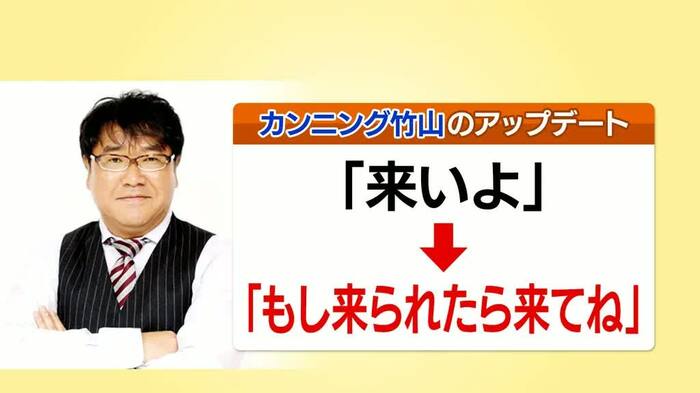「飲み会に誘うとき、以前は自分の要件も言わず、相手の都合も聞かずに『来いよ』で済ませていたが、『今ここで飲んでるけど、どう?来られたら来てね』とソフトな言い方にアップデートした」という、竹山さんの近況も紹介されました。