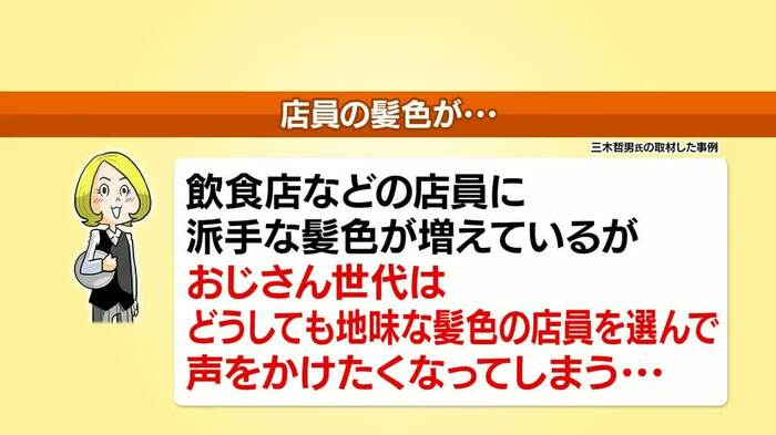 「飲食店で派手な髪色の人が増えた。おじさん世代は地味な人に対応してもらいたいと思ってしまう」という意見も紹介されました。