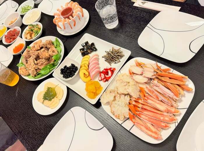 残ったおせち料理に加えて、身がぎっしりと詰まったカニを味わいます!