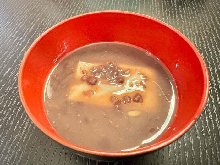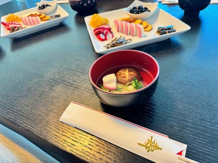 赤いおわんに入ったお雑煮を見てみると、おもちだけでなく、しいたけやかまぼこも入れられ、ほっと一息つくことができそうです。