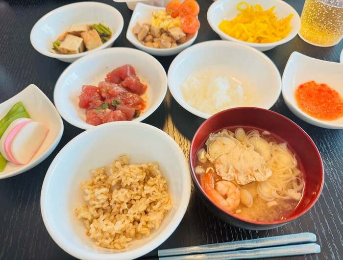 別の日の投稿では、お正月料理の残り物でランチ!テーブルには、小皿に分けられたおかずが用意され、かまぼこや漬けマグロなどを見ることができます。カニやエビを入れたみそ汁も作ったようで、余すことなく食材を使うことができ、結果的に「冷蔵庫がスッキリしました」と明かしています。