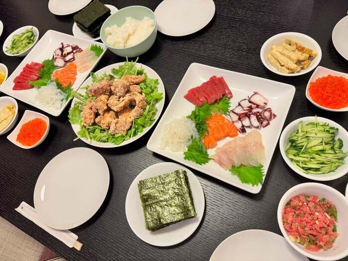 年越しディナーということで、テーブルにはサーモンやいくら、たくあんなど、手巻き寿司にピッタリなメニューが用意されています。