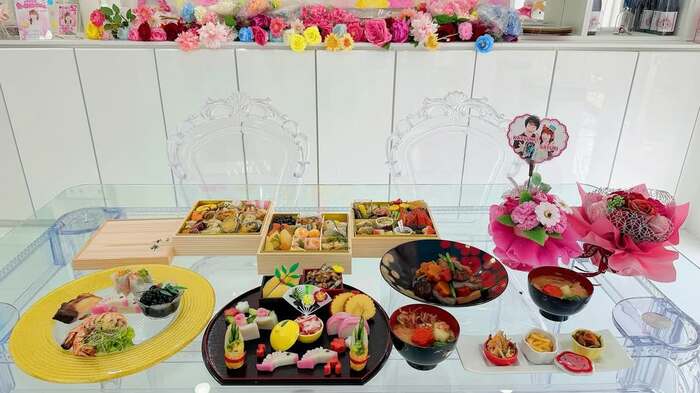 公開された写真には、ガラステーブルの上にズラリと並んだ、色とりどりの正月料理が!