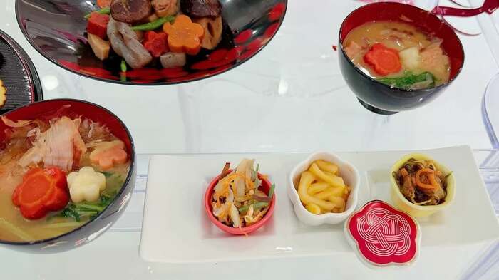 小魚とくるみの佃煮や伊達巻き、ピンクの部分をねじった手綱かまぼこなど正月らしい品が並びます。