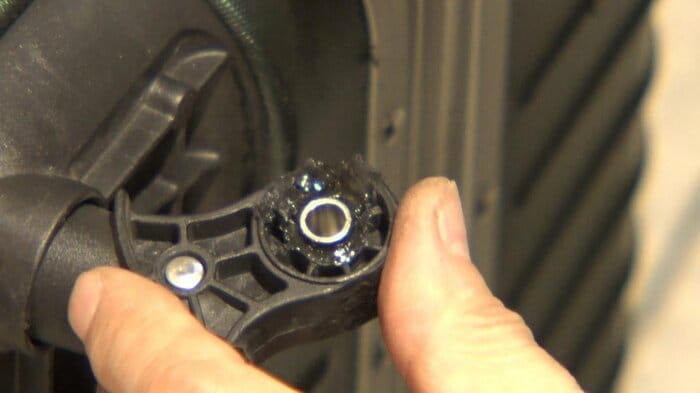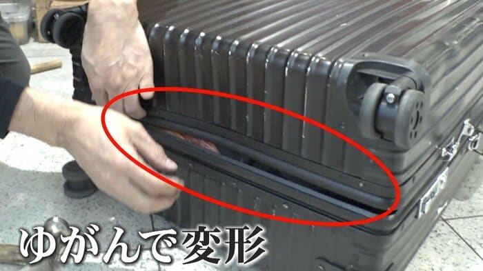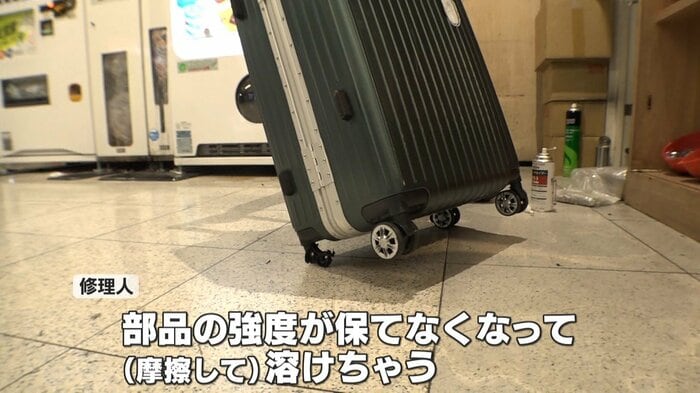 (スーツケースは)引き手だけで2輪で引っ張ると、荷物全体の重さが2個のタイヤだけにかかるので、部品の強度が保てなくなって(摩擦して)溶けちゃうんです。