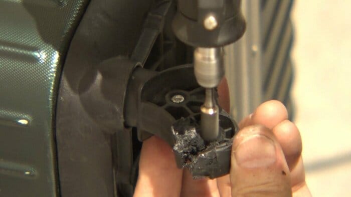 次に持ち込まれたのは、原型がわからないほどボロボロになったスーツケースのタイヤ交換依頼。タイヤの軸の部分が溶けて変形してしまったため、新たに作り直す『大手術』が必要だといいます。