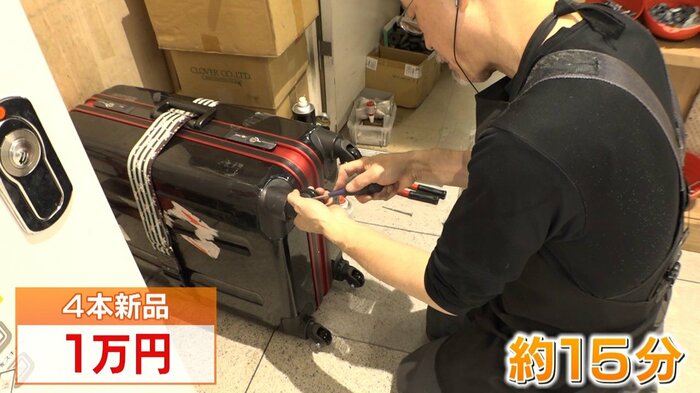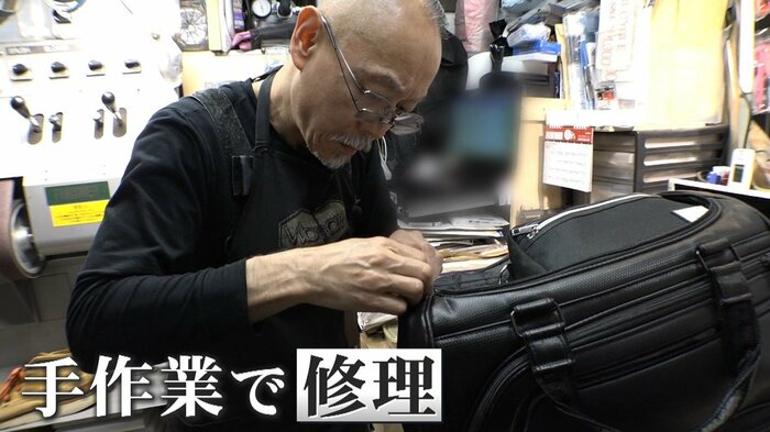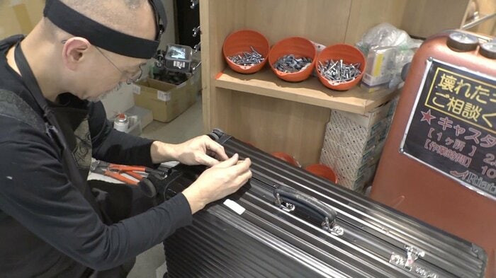 他にも、重さでつなぎ目が破損したショルダーバッグは、針と糸を使い手作業で縫い合わせ約30分で修理。取っ手が取れてしまったスーツケースも、素早く新しい取っ手に付け替えていきます。
