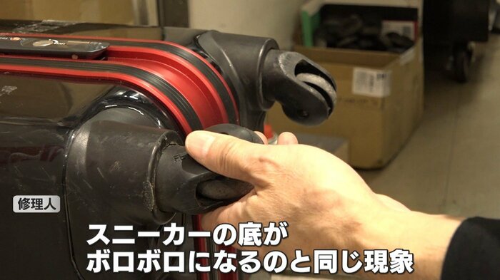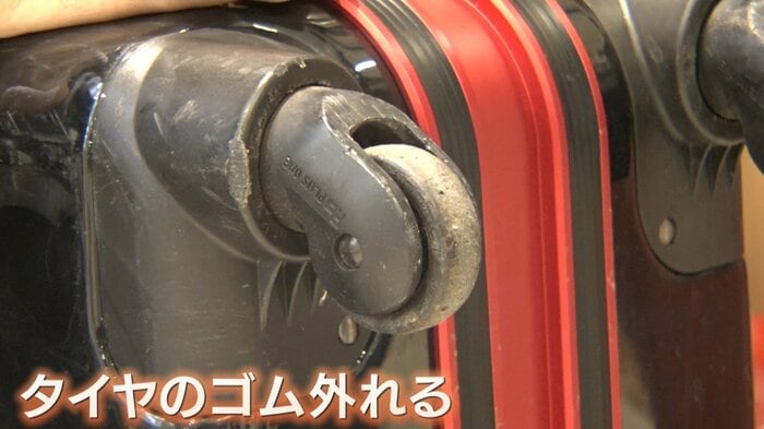 スリランカから帰国したという女性は、スーツケースのタイヤが二カ所のゴム切れ、残りの部分もゴムがボロボロという状態に。