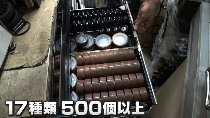 こちらの店では、あらゆるタイヤに対応できるよう、17種類500個以上もストックしています。全てのタイヤをカッターで切断して、新しいタイヤと交換。時間は15分ほどでした。