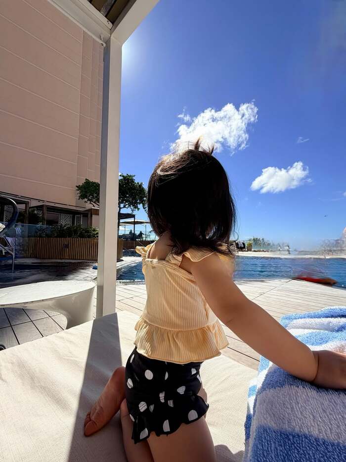 そして三女は青空の下、フリフリの水着を着てプールサイドのソファに座り、遠くを見つめていて、さんさんと降り注ぐ太陽の光がとっても気持ちよさそうです!