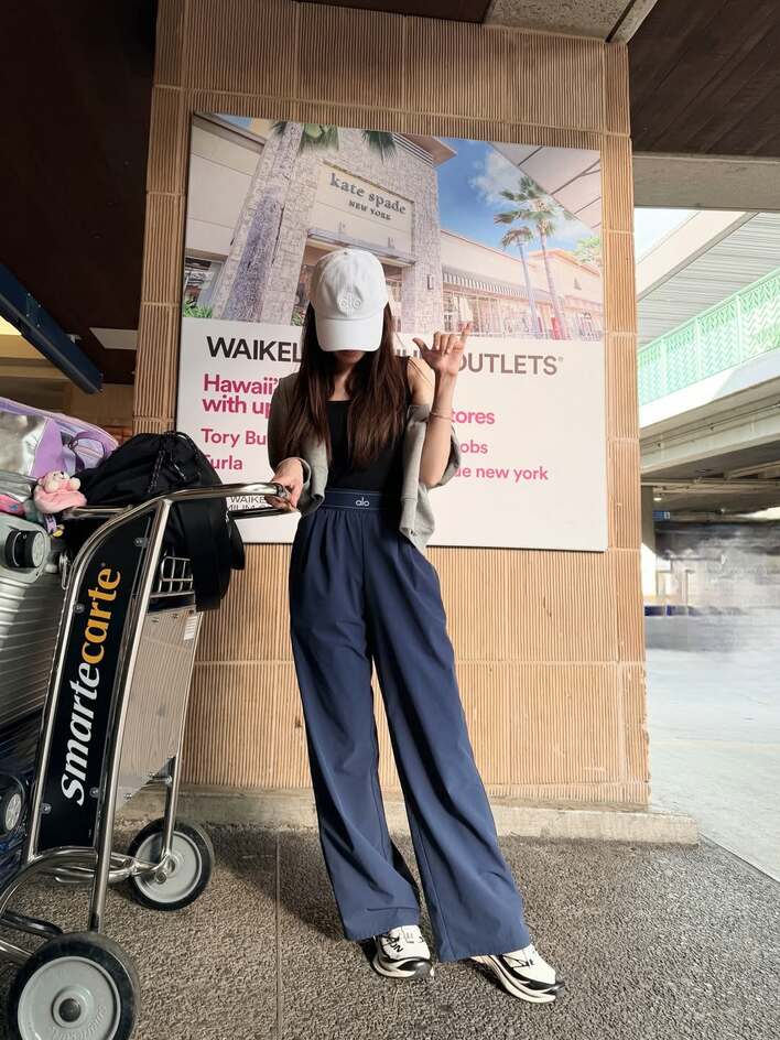 まずは、「Hawaii」の文字が書かれた看板の前に立っているショット。家族で訪れた先はハワイのようで、旅の始まりに撮ったショットなのか、手には大きなカートに積まれたたくさんのスーツケースを持っています。