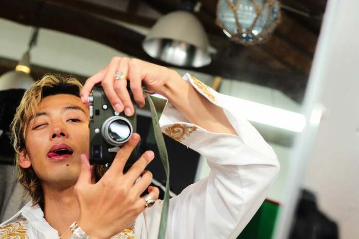 他にも、鏡越しの近距離自撮りショットでは、舌をペロッと出し、ウインクを決めた白シャツ姿の竹内さんも。目元には、長い金髪がうっすらとかかっています。