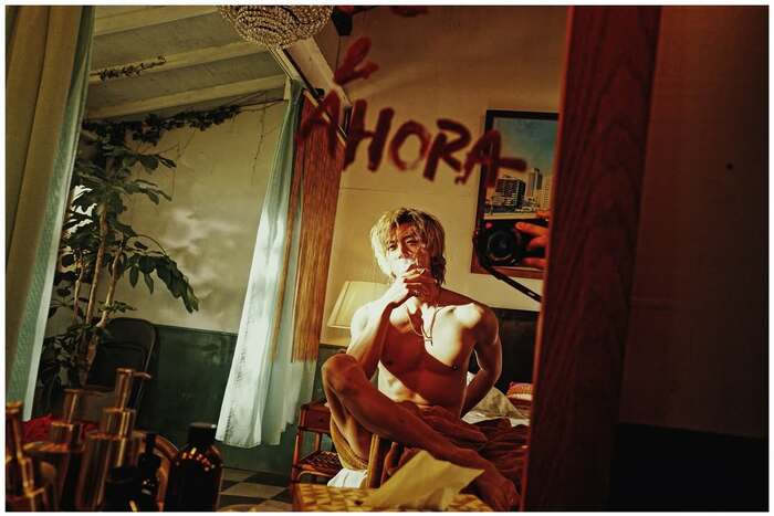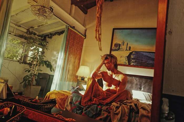 また、上半身を大胆にさらけ出し、片膝を立ててベッドに座ったショットも。