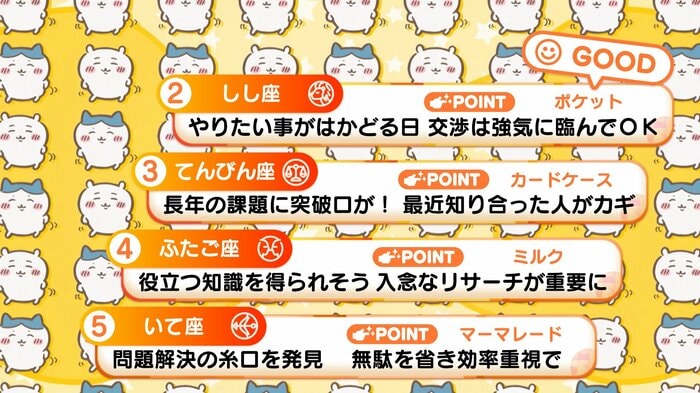 『めざましテレビ』で放送中の「ちいかわ占い」 テレビ放送がない日はお休みで、月~土:朝7時以降に更新予定です。