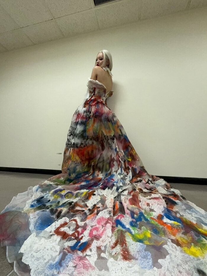 床いっぱいに広がった「ロングトレーン」には、黒い文字で英語がつづられていたり、色とりどりの模様がちりばめられていたりと、ちゃんみなさんの存在感を際立てています。