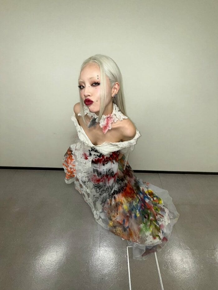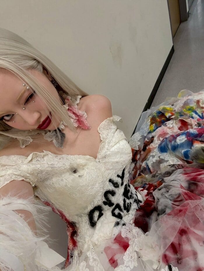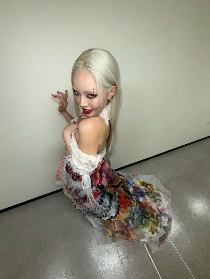 そこには、シルバー色のロングヘアスタイルに、目元や鼻辺りにストーンシールを貼ったメイクで、頬に手を当てて自撮りをする姿が。