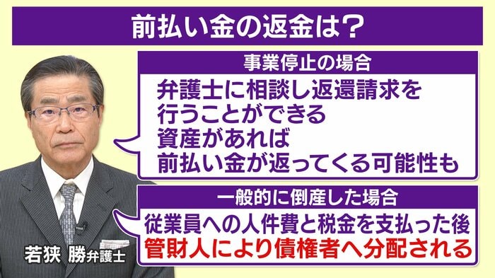 前払いの場合どのぐらいお金が戻ってくるのかですが、若狭勝弁護士によりますと事業停止の場合は「弁護士に相談し返還請求を行うことができる、資産があれば前払い金が返ってくる可能性もある」そうですが…。一般的に倒産をした場合、従業員への人件費と税金を支払った後、管財人により債権者へ分配される…ということは全額返金されるかどうかというのは、少し難しい部分もあるかもしれないということです。
