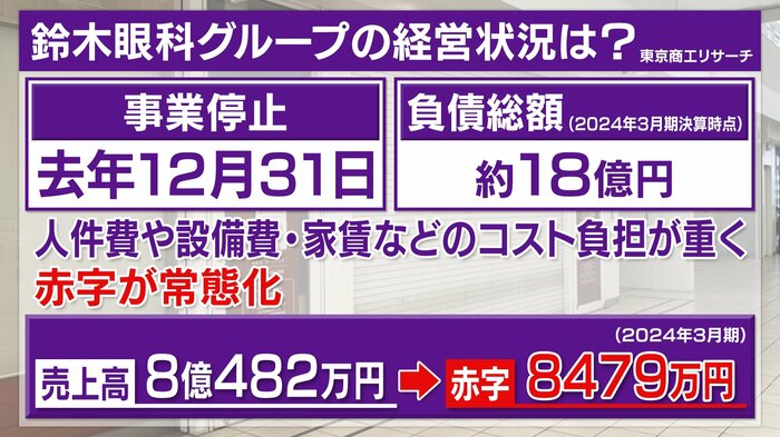 この眼科グループの経営状況ですが…東京商工リサーチによりますと、事業を停止したのが去年の12月31日。負債総額は2024年3月期の決算時点で約18億円ありました。その理由は、人件費や設備費、家賃などのコスト負担が重く赤字が常態化していたと。売り上げも8億482万円あったのですが、2024年3月期では8479万円の赤字。