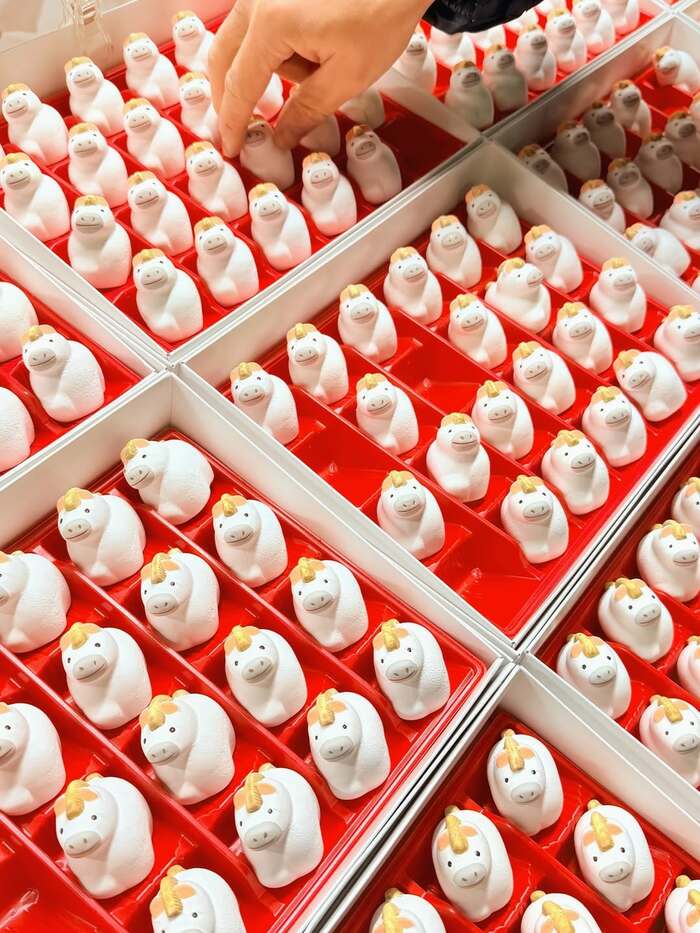 また、赤い仕切りのトレイに整然と並んだ白くて小さな馬の置物の写真も投稿。