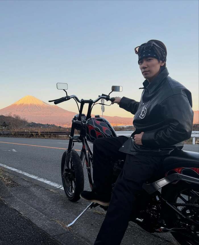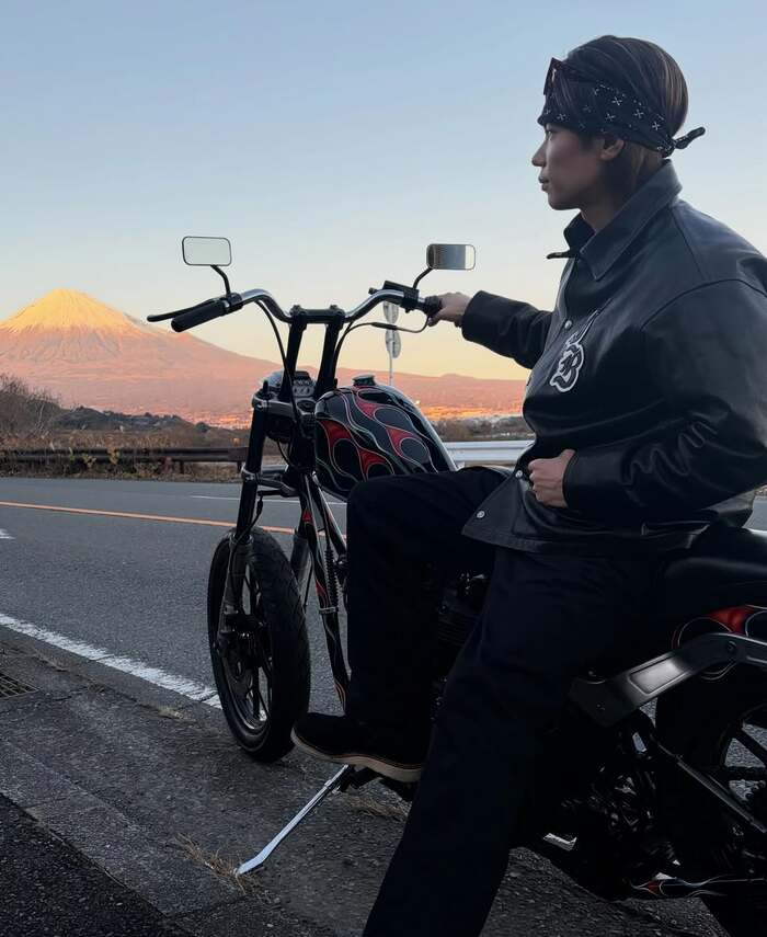 公開された写真にはレザーのライダース、パンツとシューズをオールブラックで合わせ、愛車のハーレーダビッドソンにまたがりポーズを決める姿が…!