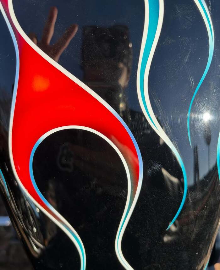 さらに、赤と青のフレイムパターンがあしらわれた車体の写真も投稿。よく見てみると、車体に反射した神宮寺さんのピース姿が収められていました。