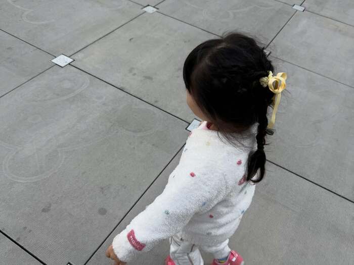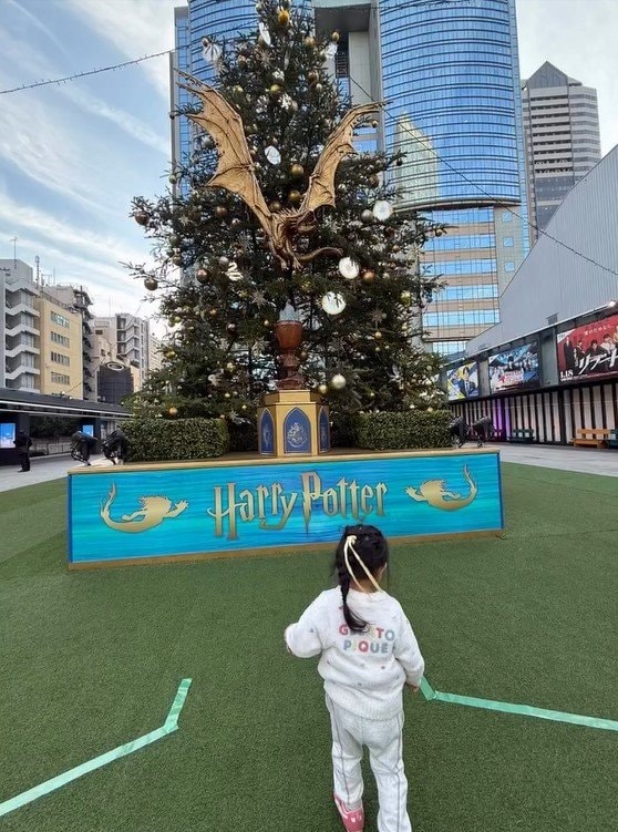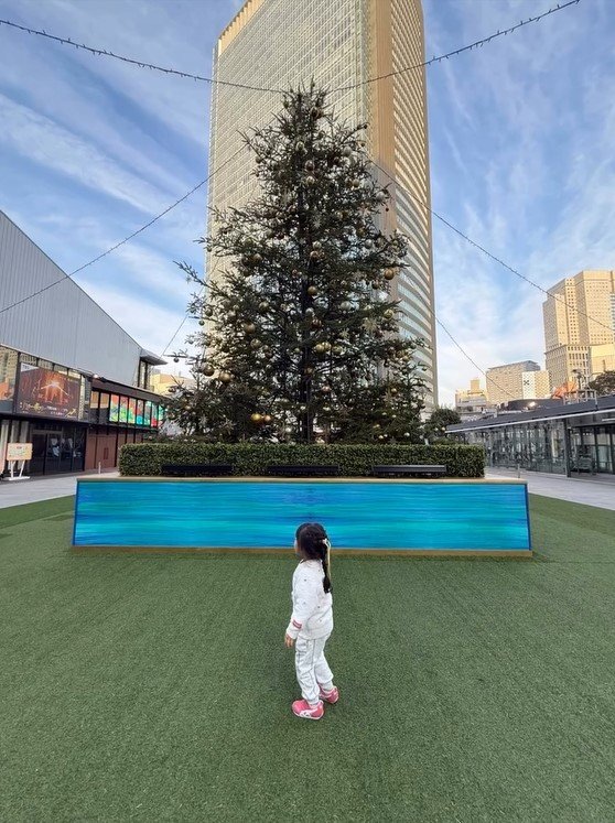 そこには、都心の広場にそびえ立つ、大きなクリスマスツリーと写真に写る“ぷくぷくちゃん”の姿が。全身白コーデで、三つ編みに結んだ髪には黄色いリボンが付けられています。