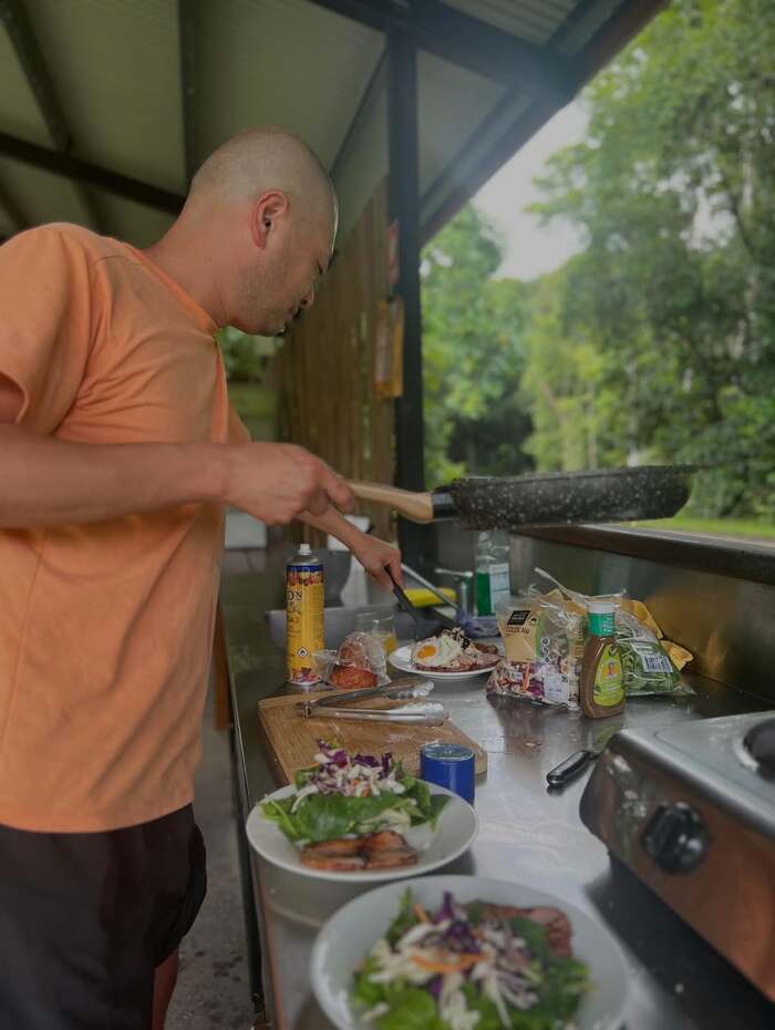 そして、大自然の中で得意のキャンプ飯を作っている様子も披露!