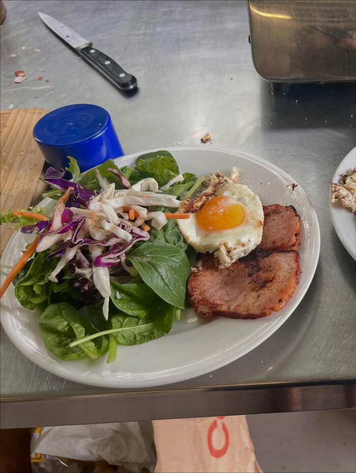 大きな平皿にこんもりと野菜を盛り付け、分厚いお肉と大きな目玉焼きをのせたら、あばれる君のおしゃれなキャンプ飯が完成です!自然の中で味わう朝ごはん、とってもおいしそうですね。