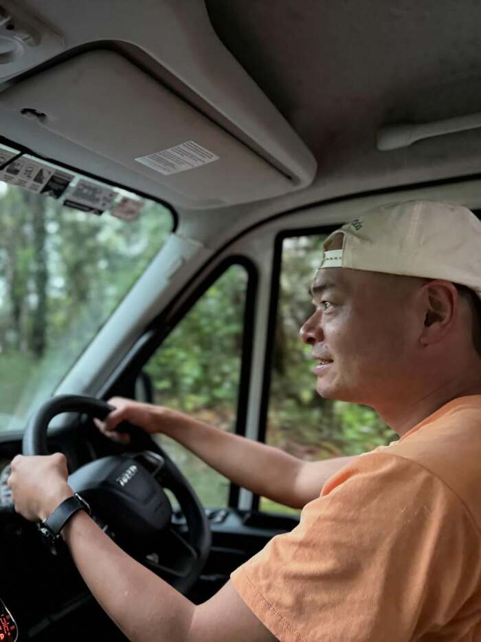 ハンドルをぎゅっと握りしめてドライブしたりと、楽しそうな様子。にっこりと笑顔を見せた横顔からは、キャンピングカーと行く旅への期待が膨らんでいることが伝わってきます。