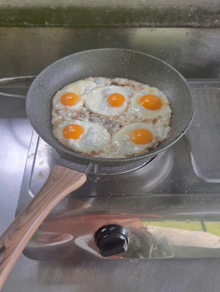 フライパンには、大きな目玉焼きが5つ。ぷくぷくとした白身とつるっと輝く黄みが、まるでジブリに出てくるごはんのようで、食欲がそそられます。