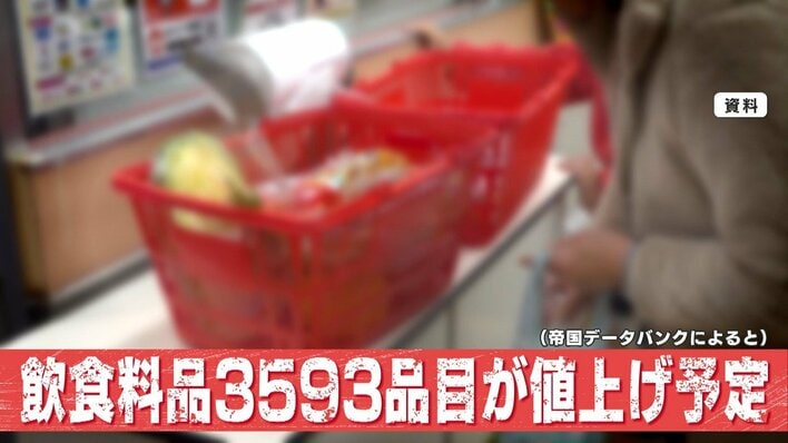 帝国データバンクによると、4月までに値上げを予定している食料品などは3593品目。冷凍食品やコメ製品、酒類のほか、マヨネーズやみそなど調味料の値上げが目立ち、平均値上げ率は14%にのぼるとしています。