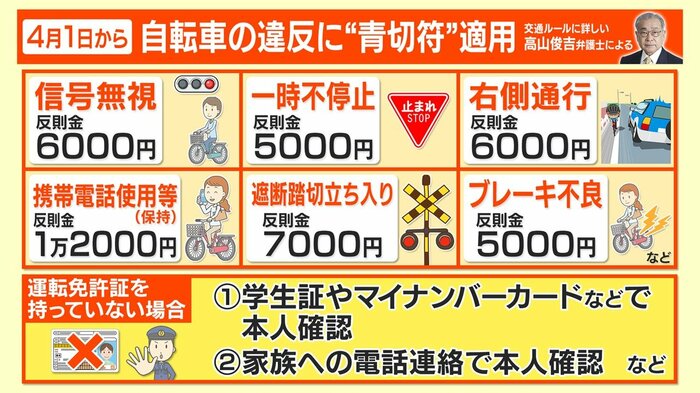 交通ルールに詳しい高山俊吉弁護士によると、特に「信号無視」「一時不停止」「右側通行」「携帯電話使用」「踏切への立ち入り」「ブレーキ不良」といった6つの違反行為について厳しく取り締まるとのことで、警察が危険性・迷惑性が高い悪質・危険な違反と判断した場合、検挙されます。16歳以上に適応されるため、高校生も対象です。
