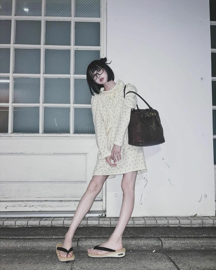 ひざ上10センチほどのミニ丈ワンピースから真っすぐ伸びる美脚が印象的です。さらに足元の雪駄風サンダルが、あのさんらしい“一風変わった雰囲気”を醸し出しています。