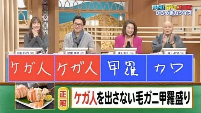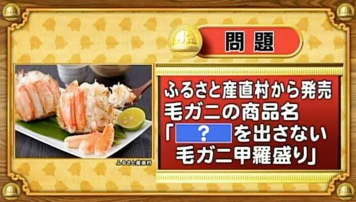次は、おもしろ商品名を当てる問題。ふるさと産直村から発売されている毛ガニの商品名「[?]を出さない毛ガニ甲羅盛り」。さて、何を出さないのでしょうか?