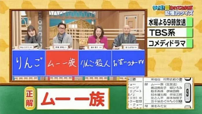正解は「ムー一族」。樹木希林さんと郷ひろみさんがドラマの中で歌った「お化けのロック』や「林檎殺人事件」などのヒット曲が有名。見事、伊東さんだけが正解!
