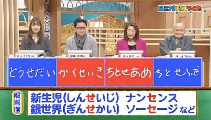 正解は「ちとせあめ(千歳飴)」「かくせいき(拡声器)」「しんせいじ(新生児)」「ぎんせかい(銀世界)」「ナンセンス」など。