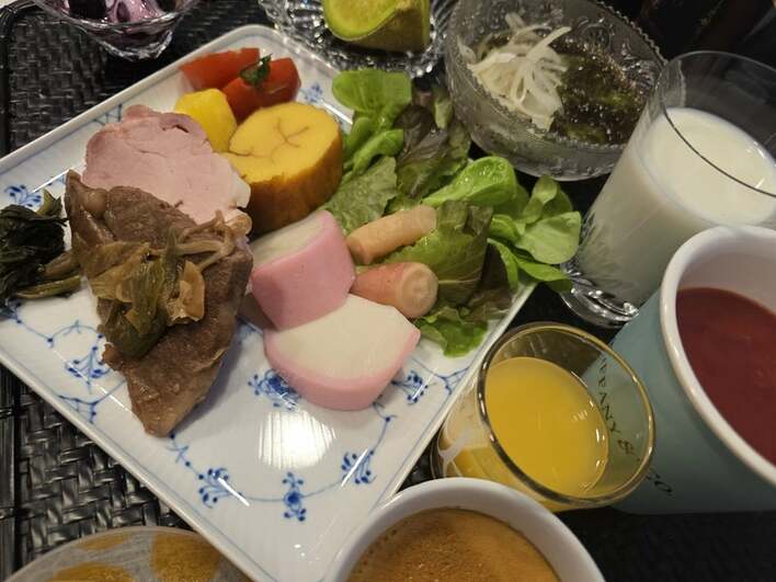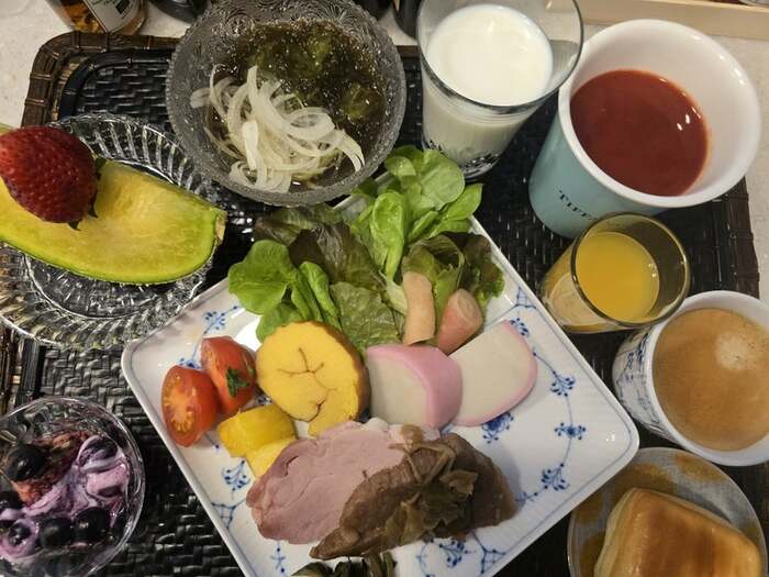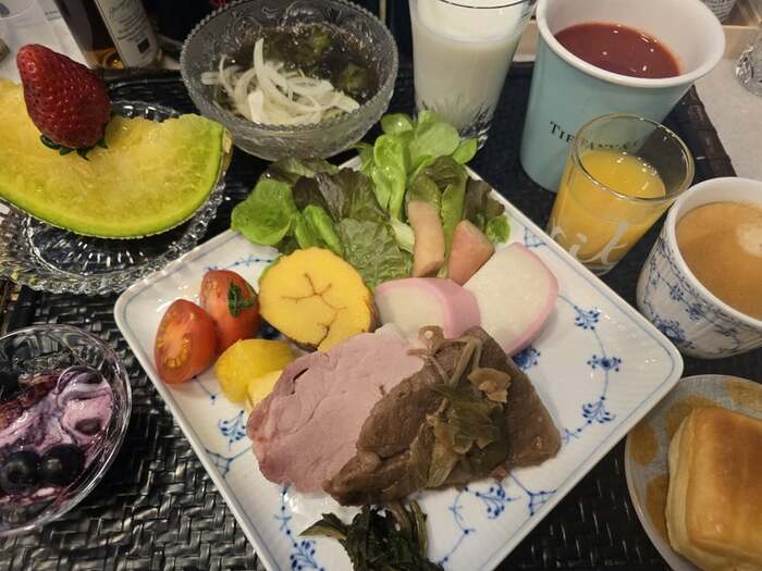 カットされたメロンに大きなイチゴも添えられていたりと、彩りある素敵な朝食に仕上がっていますね。