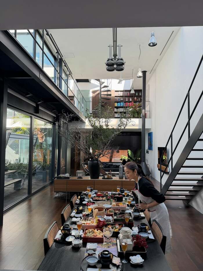 公開された写真には、モダンで開放的なリビングダイニングの長テーブルに、色とりどりの料理を並べる滝沢さんの姿が写っています。大きなガラス窓から自然光が差し込む明るい空間で、集中した表情で皿を整える様子から、丁寧な準備の過程がうかがえます。