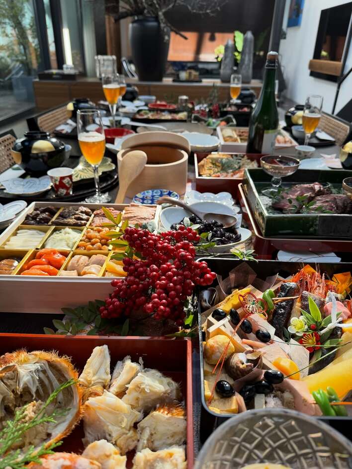 テーブルの上には、おせち料理が敷き詰められた重箱がいくつも並び、1人ずつ用意されたお盆にはお雑煮の入ったお椀と、グラスに注がれたお酒も並んでいます。とても華やかな雰囲気です。