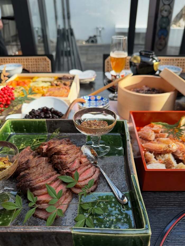 赤いお重には毛ガニが丸々っと入り、また緑色の四角いお皿にはローストビーフが綺麗に並べられています。さらに丸いおひつにはお赤飯も用意され、他にも黒豆などが小皿に配置されるなど、赤、橙、黄、黒、白といった色彩が混じり合い、食卓を鮮やかに演出しています。