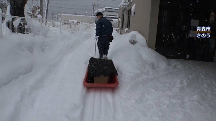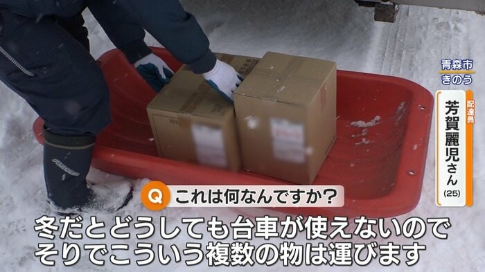 雪が深々と降り注ぐ中、配達員の芳賀さんが取り出したのは、「そり」です。車を近くに止めることができない場所などは、そりに荷物を載せて、濡れないようにカバーをして運ぶといいます。