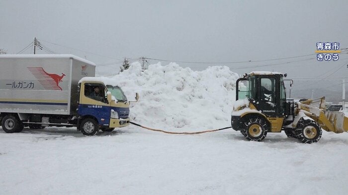 雪国では出発前のスタックは日常茶飯事。やってきた小型トラクターにロープを結び、なんとか抜け出します。